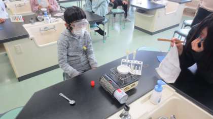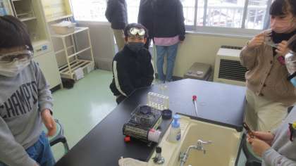 理科の実験に取り組んでいます。溶けた金属はどうなったのか、液を蒸発させて調べています。