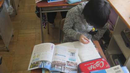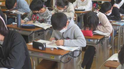 社会科の調べ学習に取り組んでいます。教科書や資料集を参考にして調べ、分かったことをノートにまとめています。とても集中している子供たちです。