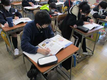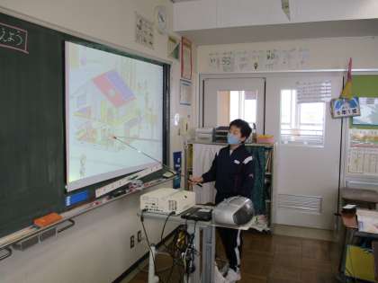 家庭科で、冬を暖かく過ごすための工夫について、自分の家で行っていることを基に話し合いました。「衣」「食」「住」それぞれに冬ならではの工夫があることに気付きました。