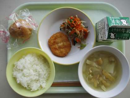 今日はメニューの中の2品をあらかじめ自分で選んでおける給食です。今日の献立は、ごま和え、エビかつ(または豚肉の竜田揚げ)、ご飯、味噌汁、牛乳、イチゴのシュークリーム(または蜂蜜レモンゼリー)です。