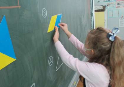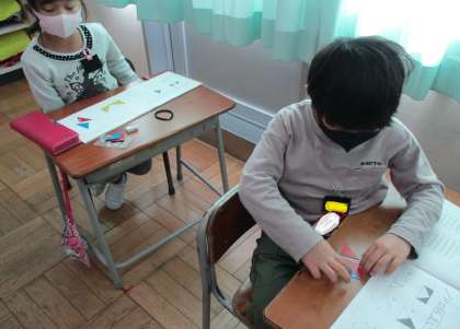 色板を使って形づくりをしました。今日は4枚しか使えません。最初は驚いていた子供たちも、4枚の色板でいろいろな形をつくることができました。そして、形は違ってもすべて同じ広さであることを確認しました。