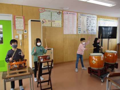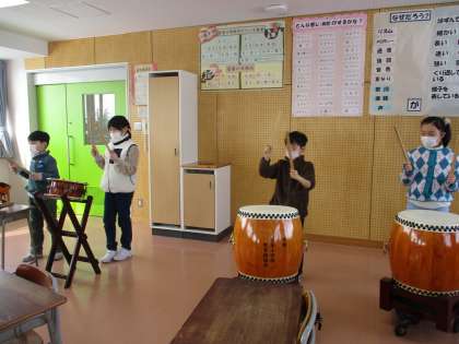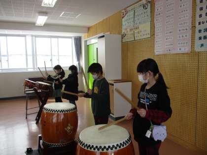 音楽の学習で、和太鼓を叩く練習をしています。リズムを正しく打てるように一生懸命に取り組んでいる子供たちの様子です。