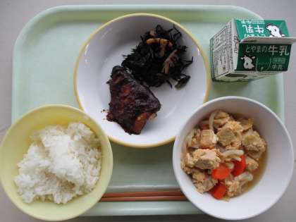 今日の献立は、魚の甘味噌かけ、ひじきと小松菜の炒め煮、高野豆腐の卵とじ、ご飯、牛乳です。