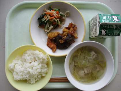 今日の献立は、小松菜のナムル、鶏肉とレバーのカレー風味、たら汁、ご飯、牛乳です。