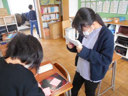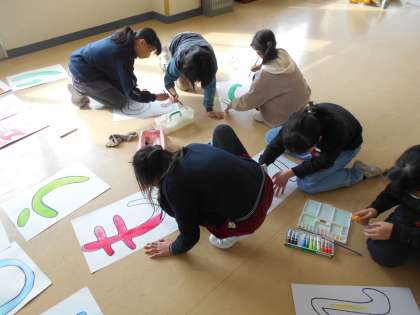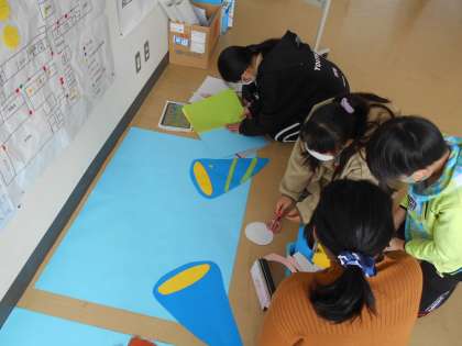 総合的な学習の時間では、6年生の卒業お祝いプロジェクトの企画・運営を行っています。プレゼント、お祝いの放送、お祝い掲示の3つのチームに分かれて活動を進めています。