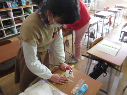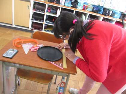 算数科では、多角形と円について学習しています。円周の長さと直径の長さを求め、その割合が3.14になるかを確認しています。正確に長さを測ることに苦戦していましたが、子供たちは、3.14に近い答えが出ると喜んでいました。