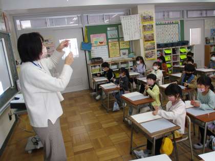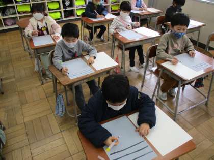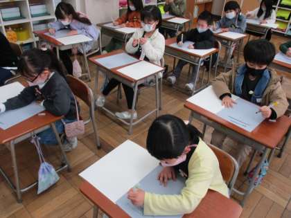水を付けただけで文字が書けることに驚いていた子供たち。「止め」「はね」「はらい」に気を付けて、漢字を書いたり自分の名前を書いたりしました。