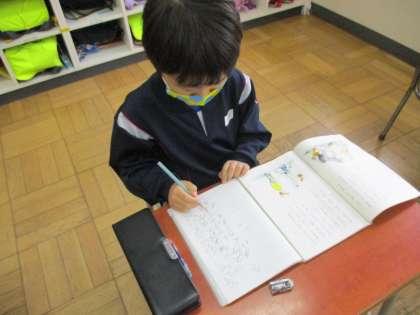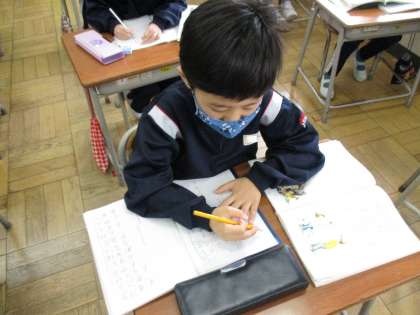 国語科「ずうっと、ずっと、大すきだよ」では、みんなが疑問に思ったことをもとに、話合いをしています。「主人公はなぜ、子犬をもらわなかったのか」「なぜ、隣の子にバスケットをあげたのか」など、子供たちは真剣に自分の考えをノートにまとめています。