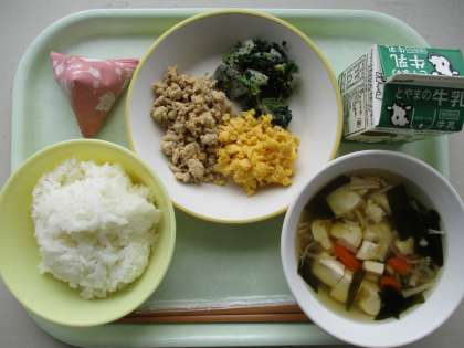 今日の給食は、鶏そぼろ、炒り卵、よごし、ご飯、すまし汁、牛乳、ひなあられです。