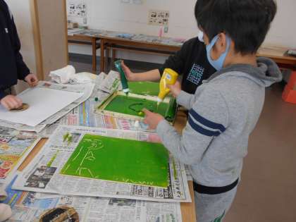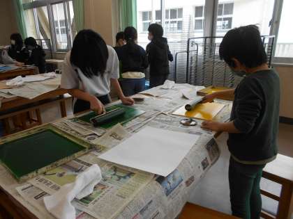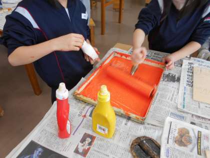 木の板を彫刻刀で慎重に彫り、自分の絵に合った色で刷りました。
