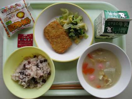 献立は、とんかつ、コーン和え、紅白しらたま汁、赤飯、牛乳、豆乳プリンタルトです。