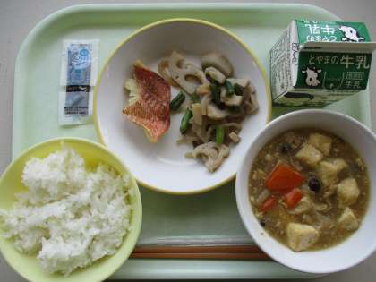 今日の献立は、赤魚の塩焼き、蓮根のきんぴら、豆腐と野菜のうま煮、ご飯、のり佃煮、牛乳です。