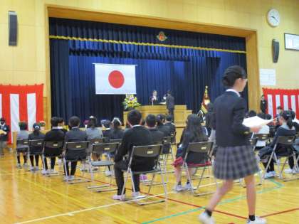 児童一人ひとりが壇上に上がり、将来の目標や家族への感謝、学校での思い出を一言ずつ述べ、校長先生から卒業証書を受け取りました。