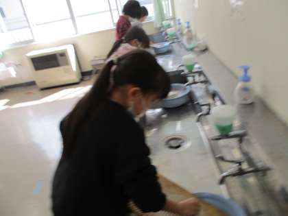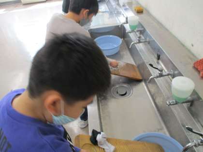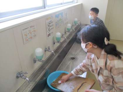 社会科「道具の移り変わり」の学習で、昔の道具の一つである洗濯板を実際に使って自分の物を洗濯してみました。まだまだ水が冷たいこの時期に、力を入れて洗濯物をこする大変さを肌で感じた子供たち。「手が痛い」「腰が痛い」など、昔の人の大変さを実感したようでした。