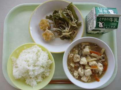 今日の献立は、にんじんシューマイ、茎わかめのチョナムル、マーボー豆腐、ご飯、牛乳です。