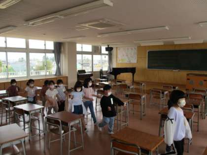 音楽室や体育館など初めての場所を回り、学校探検をしました。