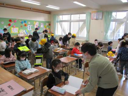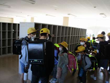 先週から始まった1年生のお世話も、だいぶ慣れてきた6年生。今週は、6年1組が担当しています。初めは、1年生に自分から声をかけることに緊張していましたが、最近では「好きなキャラクターは?」「絵が上手だね」など、1年生に喜んでもらえそうな会話をしたり、1年生を教室まで送り届ける6年生もいます。