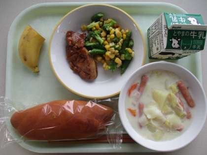今日の献立は、照り焼きチキン、イタリアンサラダ、春キャベツのクリームシチュー、米粉コッペパン、牛乳、バナナです。
