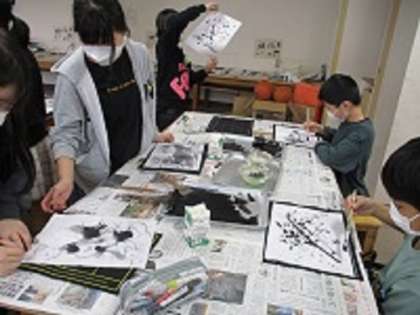 墨と筆の特徴を生かして、水墨画の世界を楽しんでいます。墨の濃さや筆の使い方を工夫した作品は、どれも素敵です。友達が描いた線や模様から、何に見えるか、クイズを出し合う子供たちもいました。