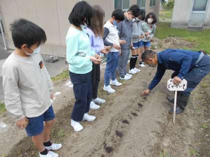 理科の学習で使用するジャガイモの植え付けを行いました。子供たちは、用務員さんに植え方のこつを教えてもらいながら取り組みました。