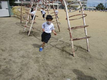 今日は初めての学年体育がありました。いろいろな種類のラインから自分の好きなラインを選び、そのラインに沿って楽しく走りました。