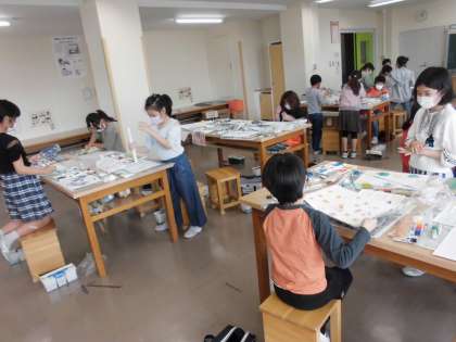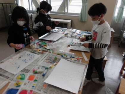 絵の具を使ったさまざまな表現技法で、模様を作り出しました。偶然できた模様や形、色の重なり方を楽しみながら表現する姿が見られました。