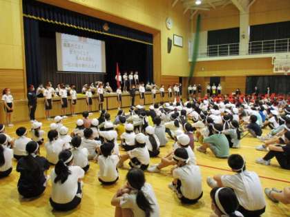 4月27日(水)、運動会結団式がありました。今年度のスローガンは、『自分の力を発揮しベストをつくし、オリンピックよりも熱く、最高の運動会をつくり上げよう』です。友達と協力したり励まし合ったりしながら、自分の力を出し切ってほしいと思います。そして、スローガンの言葉どおり、思い出に残る最高の運動会になることを願っています。