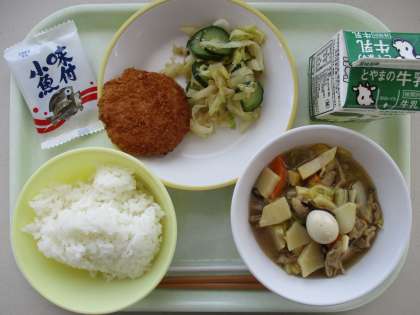 今日の献立は、えびカツ、キャベツの華風和え、八宝菜、味付け小魚、ご飯、牛乳です。