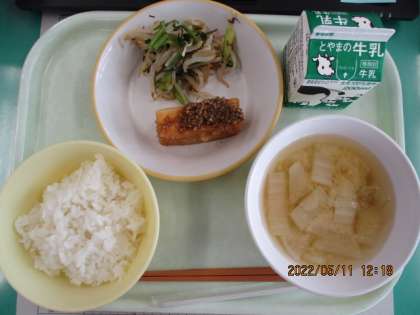 今日の献立は、揚げ出し豆腐の胡麻たれがけ、昆布和え、つみれ汁、ご飯、牛乳です。