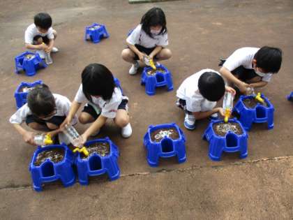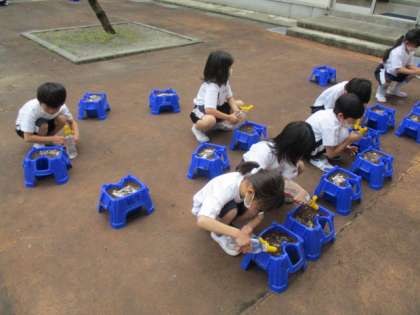 あさがおの成長を楽しみにしている子供たちは、毎日熱心に水やりをしています。子供たちは、朝登校すると「芽が出たかな?」「早く水やりしたい」と話し、あさがおを大事に育てようとしています。