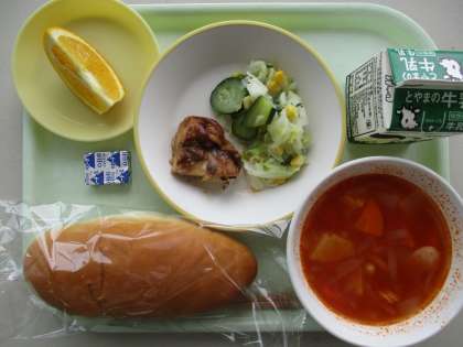 今日の献立は、照り焼きチキン、コールスローサラダ、ミネストローネ、ポケットチーズ、コッペパン、牛乳、甘夏みかんです。