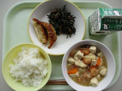 今日の献立は、エビと豆腐のうま煮、焼き餃子、ひじきのゴマ和え、ご飯、牛乳です。