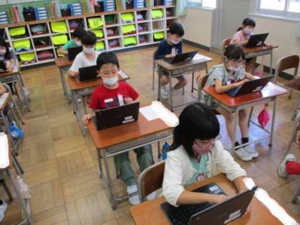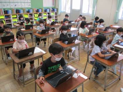 各自のパソコンを使いました。パスワードの入れ方を知り、写真を撮ったり絵を描いたりしました。分からないときは友達と教え合う姿が見られました。