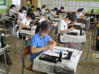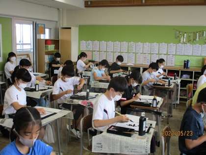 落ち着いた雰囲気の中で、習字の学習を行いました。点画のつながりを意識して「きずな」という字を書きました。平仮名文字はとても難しいですが、子供たちは集中して書いていました。