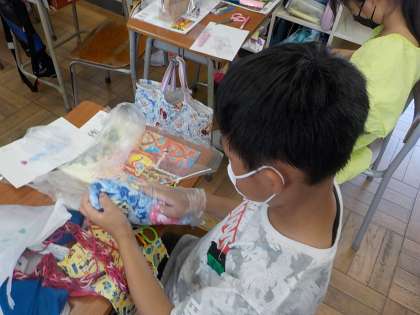 透明な袋に、布の端切れや毛糸、色紙等を入れて組み合わせ、カラフルな友達を作りました。