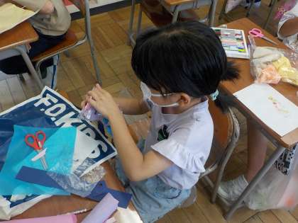 子供たちはぎゅっと縛ったり、テープで体と頭をくっつけたりしながら、楽しい作品にしようと意欲的に取り組んでいます。