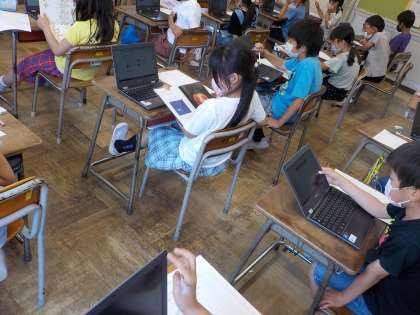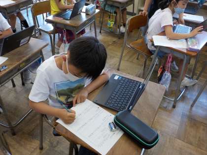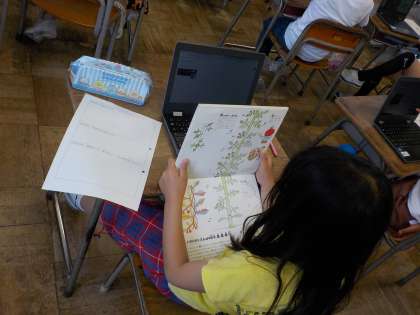 昨日は野菜の成長について話し合い、知りたいことを出し合いました。今日は、その疑問について本やインターネットを活用して調べました。野菜の育て方について、新しいことが分かったり、新しい疑問がわいたりしていました。