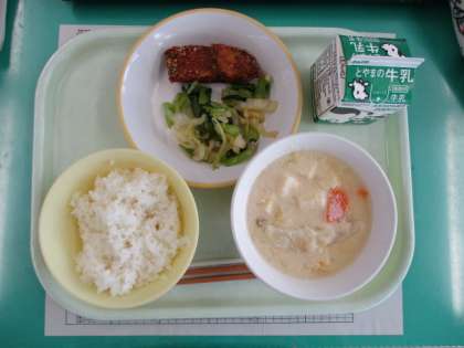 今日の献立は、魚の竜田揚げ、小松菜浸し、呉汁、ご飯、牛乳です。