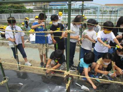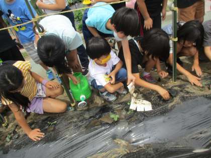 ヘチマを植えて2週間が過ぎ、葉も3〜4枚に増えてきたため、畑へ植え替えに行きました。今後愛情をこめてもっと大きく育ってほしいと願っている子供たちでした。