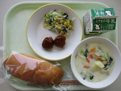 今日の献立は、ミートボール、水菜のサラダ、ホタテのクリーム煮、コッペパン、牛乳です。
