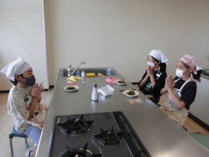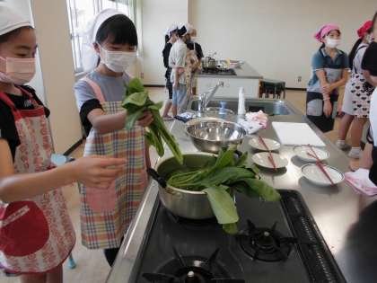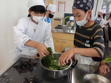 包丁を初めて触る子や、野菜を初めて洗う子がいる中で、家でもお手伝いをがんばっている!とはりきって調理する子供もいました。全員が協力して作ったおひたしは格別だったようでみんなもりもり食べていました。