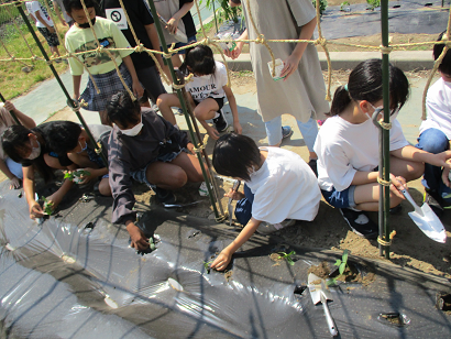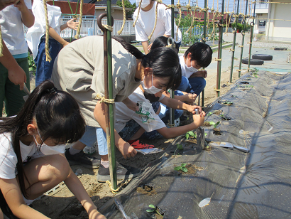 理科の学習で育てるヘチマを、ポットから畑の方へ植え替えました。子供たちは、植え替えるときの苗の持ち方に気を付けて、より大きくなってほしいという願いを込めながら作業をしていました。