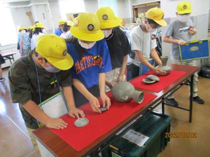 今日は、社会科の歴史の学習で、富山県埋蔵文化財センターに行ってきました。3つの活動に取り組みました。