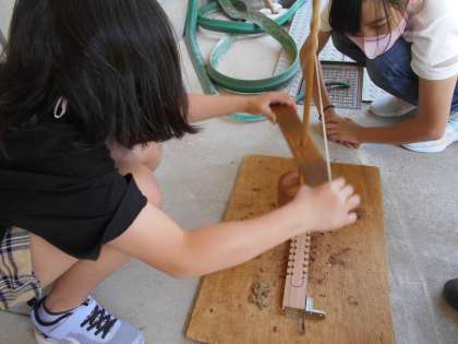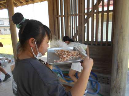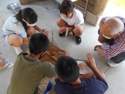 「火起こし体験」の様子です。最初は苦戦していましたが、こつをつかむとだんだん上手になり、どのグループも火を起こすことができました。
