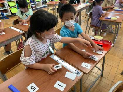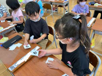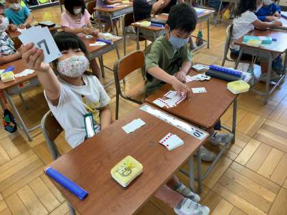 算数科では、算数ボックスの教材を使ってゲームを行い、楽しみながら数に対する感覚を養っています。