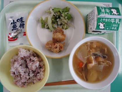 今日の献立は、鶏肉のから揚げ、ゆかり和え、すいとん、味付け小魚、雑穀入りご飯、牛乳です。