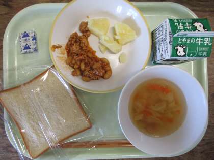 今日の献立は、チリコンカン、粉ふきいも、キャベツスープ、ポケットチーズ、食パン、牛乳です。