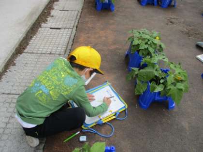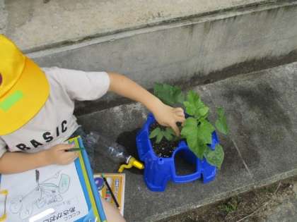 子供たちが育てているあさがおが、すくすくと成長しています。