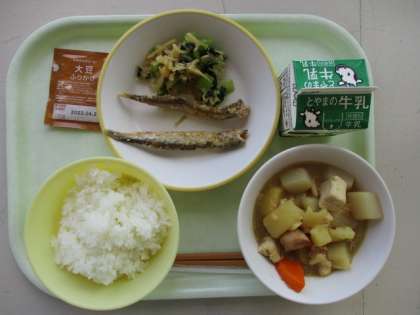 今日の献立は、ししゃものから揚げ、ハリハリ和え、鶏肉とジャガイモの胡麻煮、ご飯、牛乳、大豆ふりかけです。