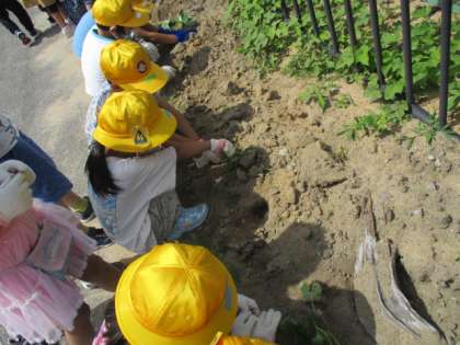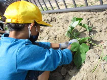そこで、用務員さんに相談し、間引きすることになりました。子供たちは優しく土を掘り起こし、アサガオの苗を新しい場所に移し替えました。間引きしたアサガオも大切に見守っていきます。